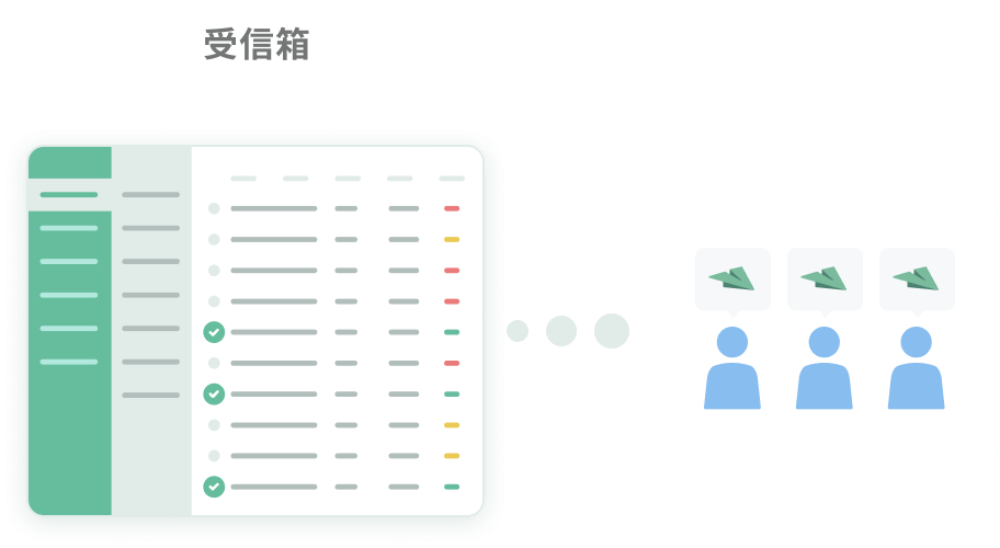Tayoriの受信箱はチームのみんなで閲覧可能。メールごとに担当を振り分けることができるので、チームでのタスク分担が可能になります。担当者が一人の場合は、ステータス管理機能がそのまま個人のタスク管理として利用できます。